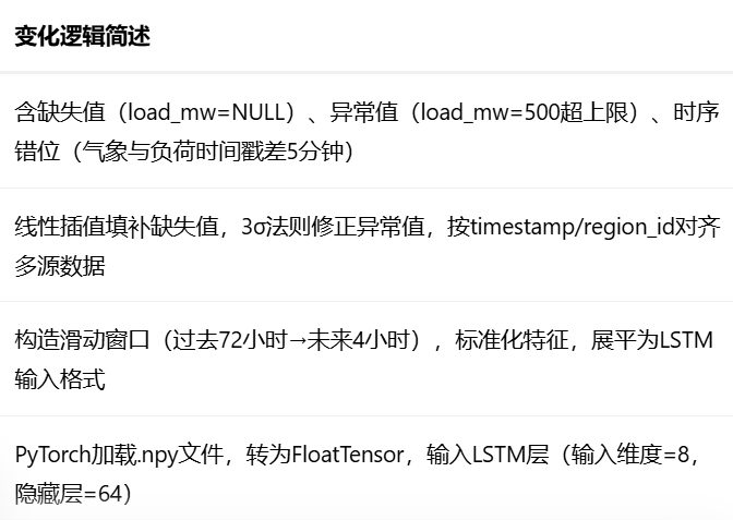 - 时序特征:历史负荷(过去24小时96个点,即t-96到t-1)、负荷变化率(差分)