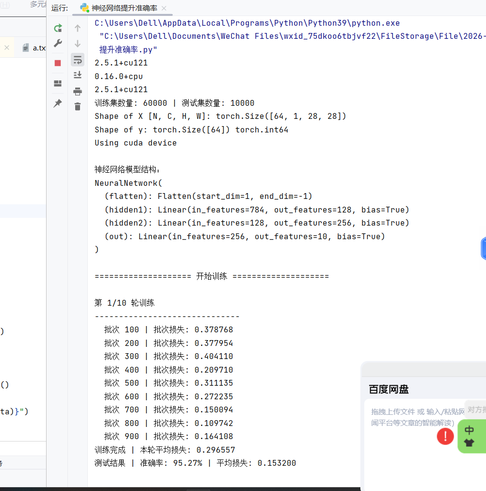 nn.Module,重写__init__(定义层)和forward(前向传播) - 层结构:输入层(28×28=784 维)→ 隐藏层(128 维→256 维)→ 输出层(10 维,对应 10 个数字)