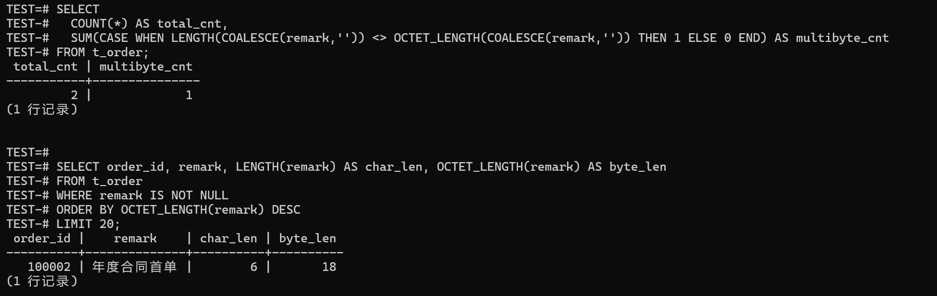 SELECT order_id, remark, LENGTH(remark) AS char_len, OCTET_LENGTH(remark) AS byte_len