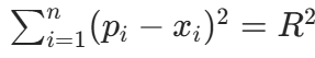 n 维球体的球心(x1,x2,...,xn)满足:球面上任意一点(p1,p2,...,pn)到球心的距离的平方等于半径的平方,即