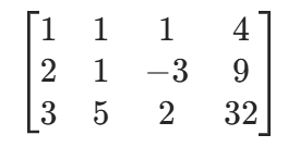 - 输入:第一行正整数 n,接下来 n 行每行 n+1 个整数,代表方程组的系数和常数项;