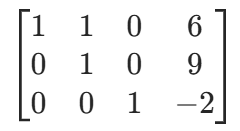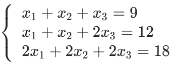 非零行数量 = 2 < 未知数数量 = 3,存在 1 个自由元x2,解为x1=6−x2,x3=3,x2可取任意值,对应无穷多解。