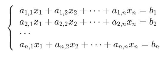 其中x1,x2,...,xn是待求解的未知数,ai,j是第 i 个方程中xj的系数,bi是第 i 个方程的常数项。