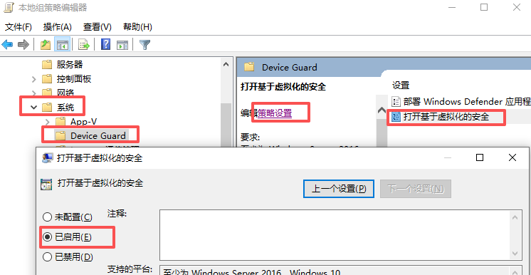 4、打开基于虚拟化的安全,设置已启用。
