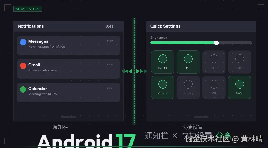 近日,Telegram 频道 Mystic Leaks 曝光了 Android 17 的最新内部界面截图,揭示了一个用户期待已久的重大交互变化------通知面板和快捷设置面板正式分离。