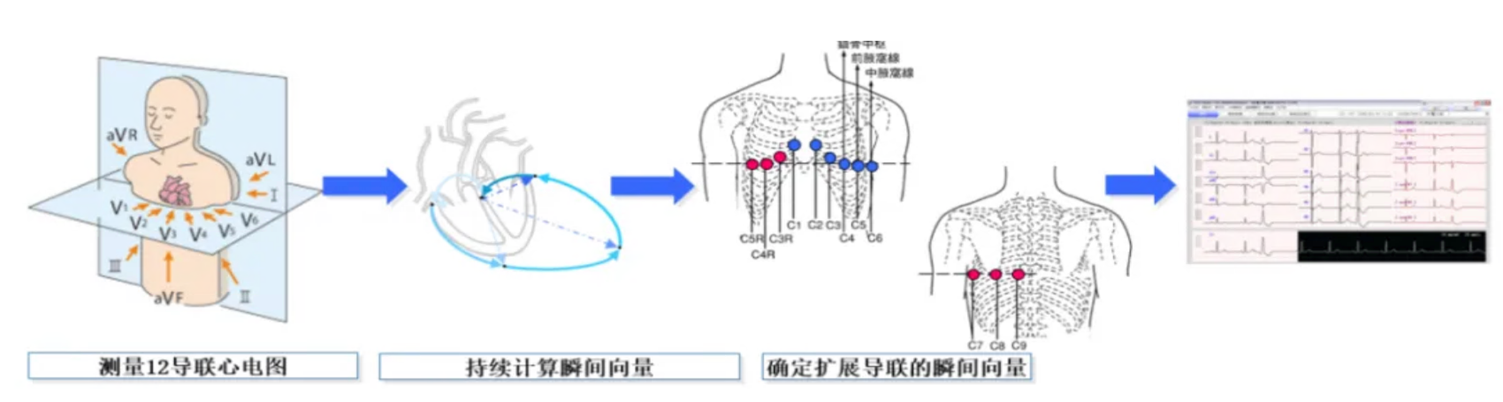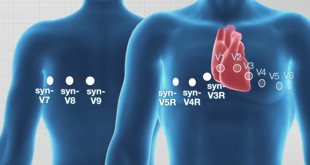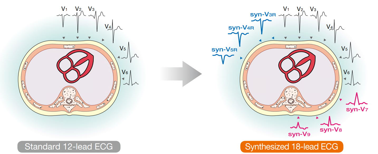 虽然 12 导联心电图(ECG)是临床标准,但其灵敏度不足以检测某些疾病,如发生在后室或右心室壁的急性心肌梗死(AMI)。如 AHA、ACC 或 ESC 等指南建议,对于疑似急性冠心病综合征的患者,应测量额外的导联(V3R-V5R 和 V7-V9)。日本循环器官学会的指南中也表述了右胸导联(V3R、V4R、V5R)和背部导联(V7、V8、V9)的必要性。