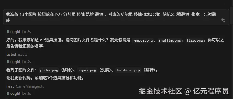 每生成一次 ,就git commit一次,日志内容就是对话内容,方便回溯,下面是做道具功能时大战的10多回合。