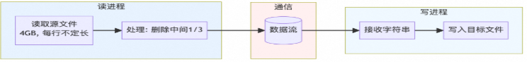 有一个 4GB 的 ASCII 文本文件(约 1.14 亿行),需要移除每行中间的 1/3 内容,输出到新文件(约 2.7GB)。由于内存限制,不能一次性加载整个文件。