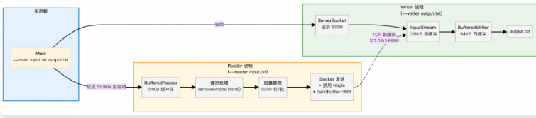 本文是一次针对4GB大文件(1.14亿行ASCII文本)进行"删除每行中间1/3内容"操作的端到端性能优化实录 ,核心目标是在内存受限前提下,通过多语言(Java/C++/Rust)实现高吞吐、低延迟、高正确性的双进程流式处理 。全文围绕减少系统调用、消除冗余对象分配、匹配底层I/O特性(如预读块)、绕过不必要的抽象开销(如UTF-8验证、流封装) 四大主线,系统性地展示了从初始637秒(Java)到最终3.2秒(新架构)的百倍级优化过程,并提炼出可复用的通用原则(如大缓冲区、字节操作、零分配、原生系统调用等)及进阶解耦架构(IO进程 + Processor进程)。