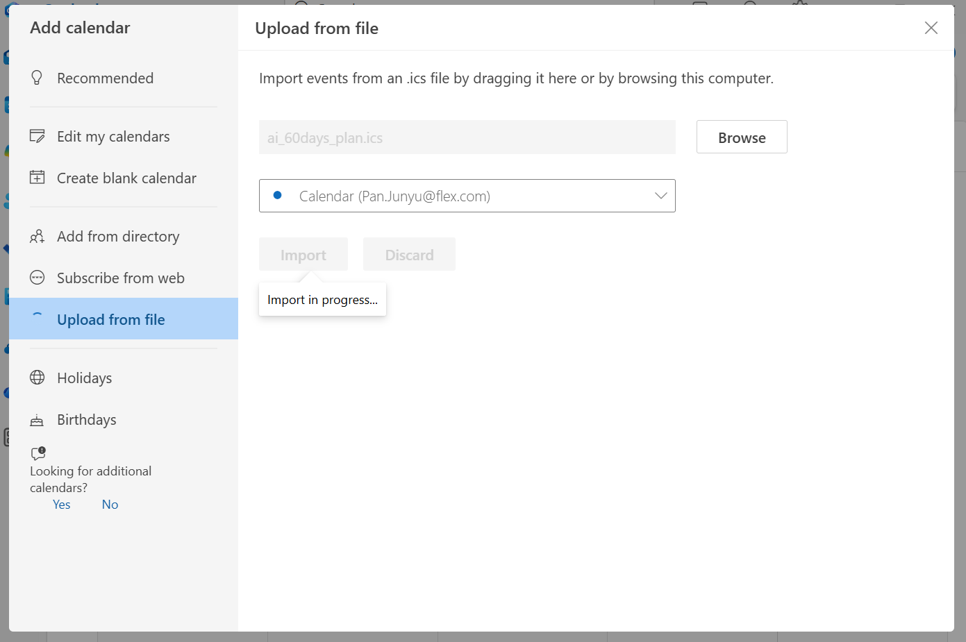 - 打开 Outlook 日历 → "添加日历 / 导入日历"。