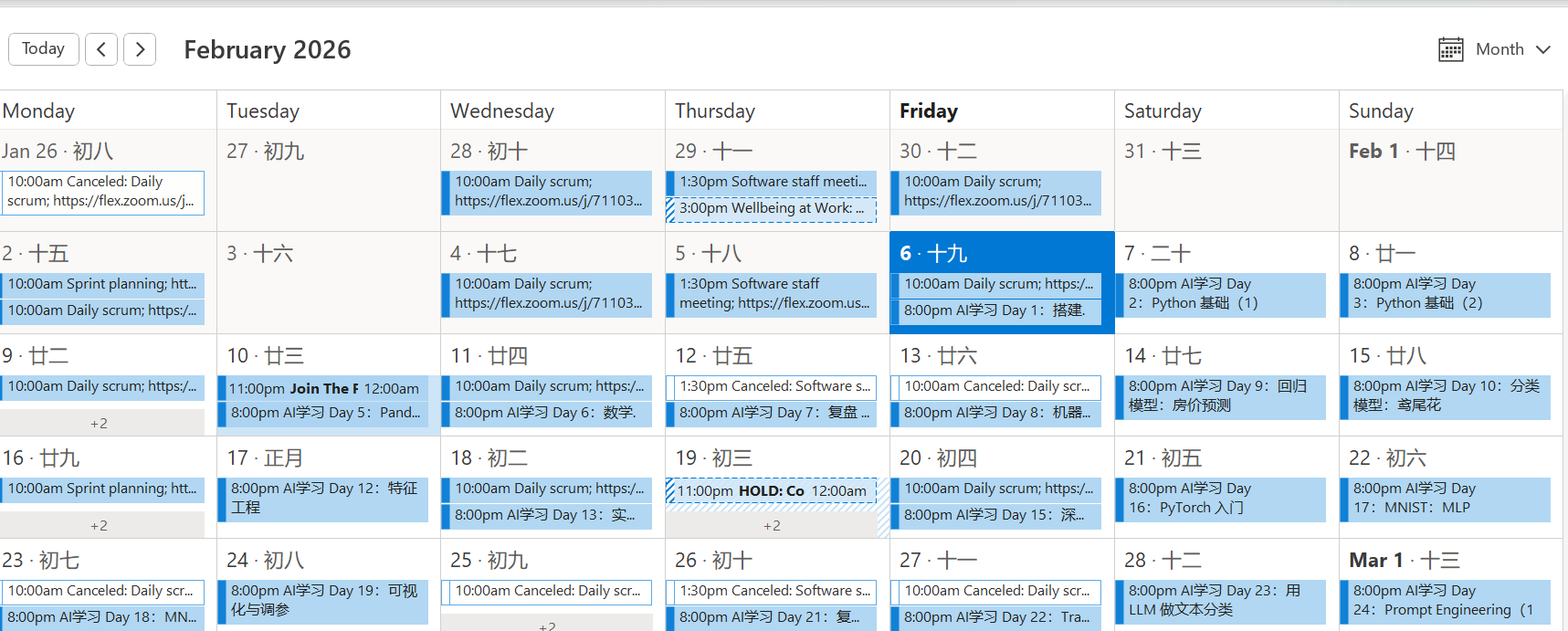 打开OutLook的日历,视图切换到Month,即可看到日程已经成功导入,会提前15分钟提醒,时间看到都安排在每日的20:00到21:30.看到这样的界面就说明成功了。