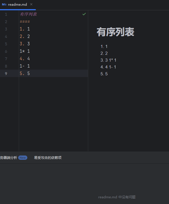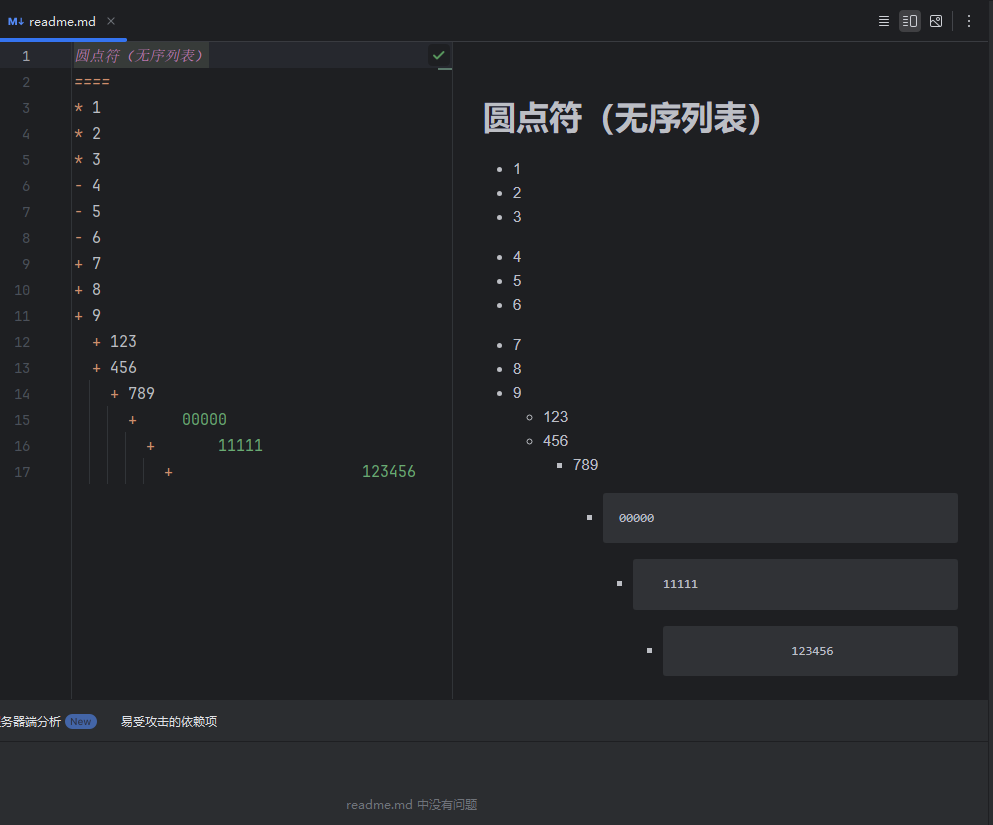 圆点符号:使一个 * 星号、 - 横杠 或者 + 加号 再使用一个字符空格隔开即可形成无序列表,形成层级缩进(*Space 、 -Space 、 +Space);后续层级可使用 tab 键分开,使用两个及以上时可高亮显示;
