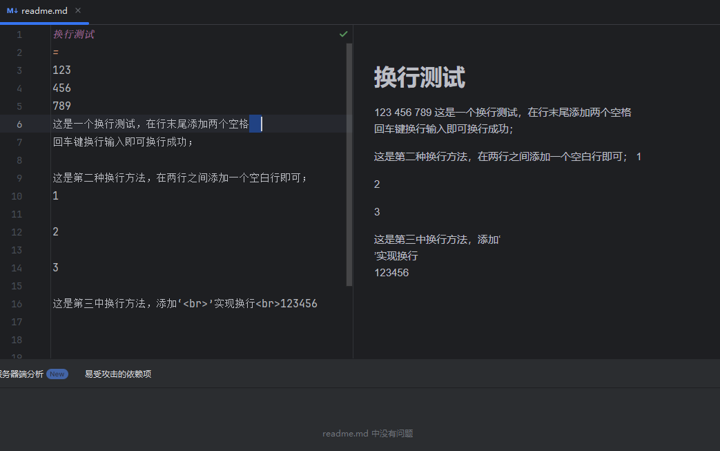 在上面的示例当中可以看到,并不能直接换行;
