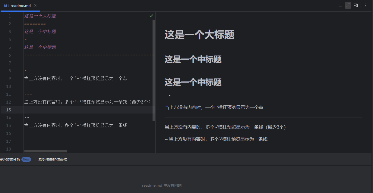 在标题文本下方添加"-"横杠(横杠 -),在标题文本最近的下方添加横杠,那么横杠上面的文本就成为了一个中标题,横杠数量最少一个,暂无个数限制;当横杠最近的上方没有文本内容时,一个横杠显示预览为一个圆点,最少三个横杠时显示预览为一条直线;