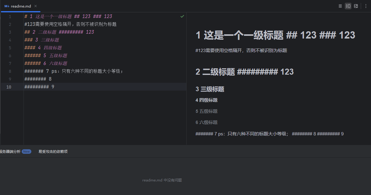 在标题文本前添加"#"井号(# Space),如若将一段文字定义为标题,只需要在文字前面加上 #,在井号后使用一个空格 Space 分开(一个字符空格),再写标题文本就行了;这种方法便于标题之间的等级划分,每增加一个 # ,标题字号相应降低一级,总共有 6 个等级;如下图示例: