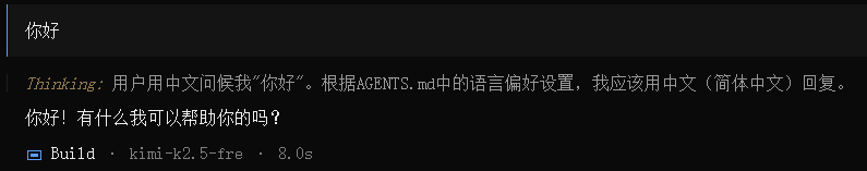 比如我希望模型输出的内容是中文,可以在 AGENTS.md末尾添加: