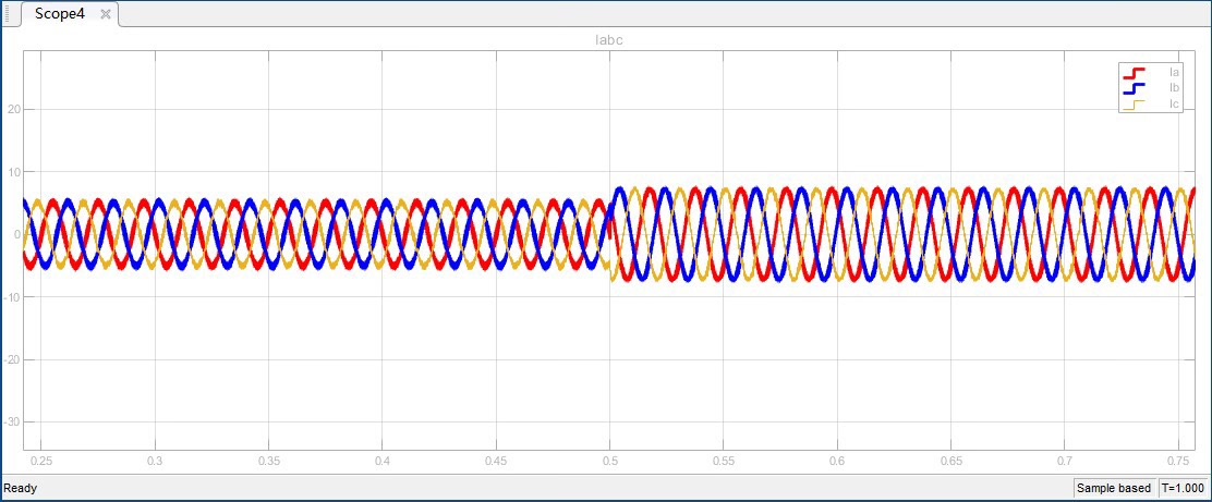 Iq 在 0.5s 时由 0 完成到 5A 的阶跃,并且追踪也要完美。从仿真结果来看,系统电压追踪稳定时间短,超调量低,性能完好。这得益于前面提到的控制策略,能快速调整电流,稳定电压。