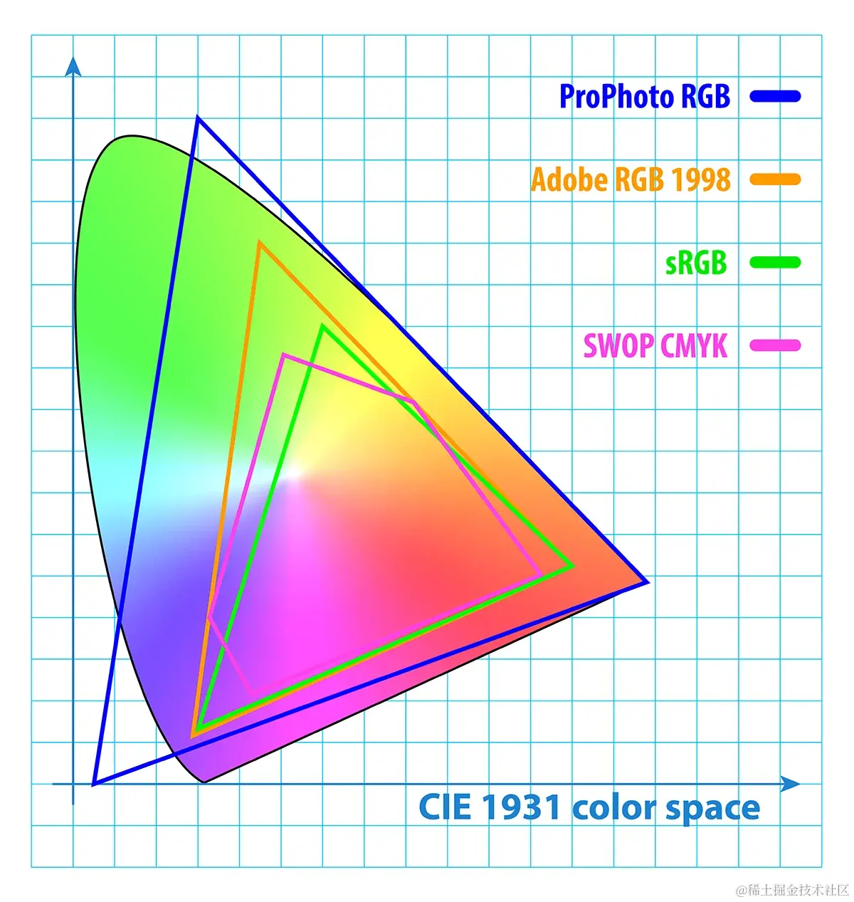 如果说 CIE XYZ 是一本包含了几十万词条、大而全的《牛津英语大词典》,那么我们在日常交流中,其实只需要一本几千词的《日常口语手册》就足够了。 强行传输 XYZ 这种海量数据,既超出了显示器的承载能力,也拖慢了网速。