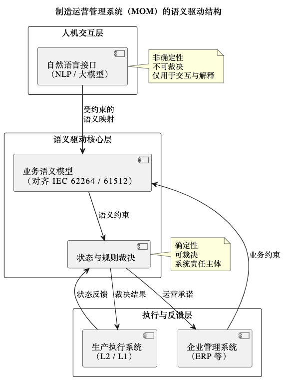 MOM 系统处于制造系统体系结构的 L3 层,其核心职责并非信息展示或人机交互,而是对生产运行过程进行可裁决、可承诺、可追溯的运营管理。这一工程前提决定了 MOM 系统必须具备严格的确定性边界,而不能依赖本质上具有统计不确定性的自然语言驱动机制。