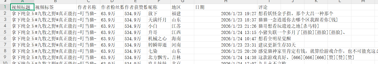 csv.DictWriter结构化写入数据,字段包括视频信息、作者信息、评论信息; -