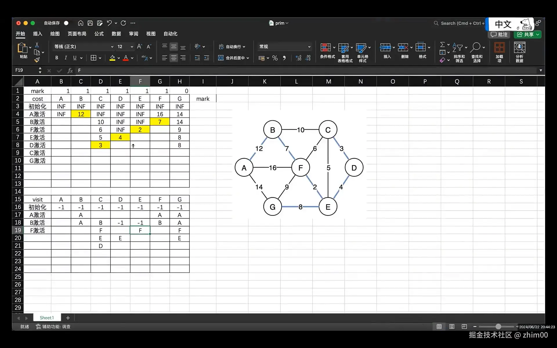 * mark: 保存哪些顶点还未激活,Prim算法核心就是不断的激活顶点,直到全部顶点都激活