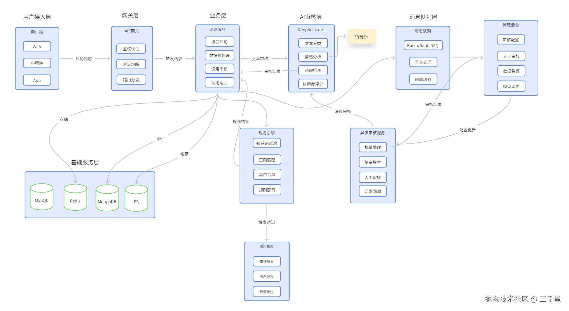 AI审核虽然智能,但成本远高于规则引擎。我的分层策略: