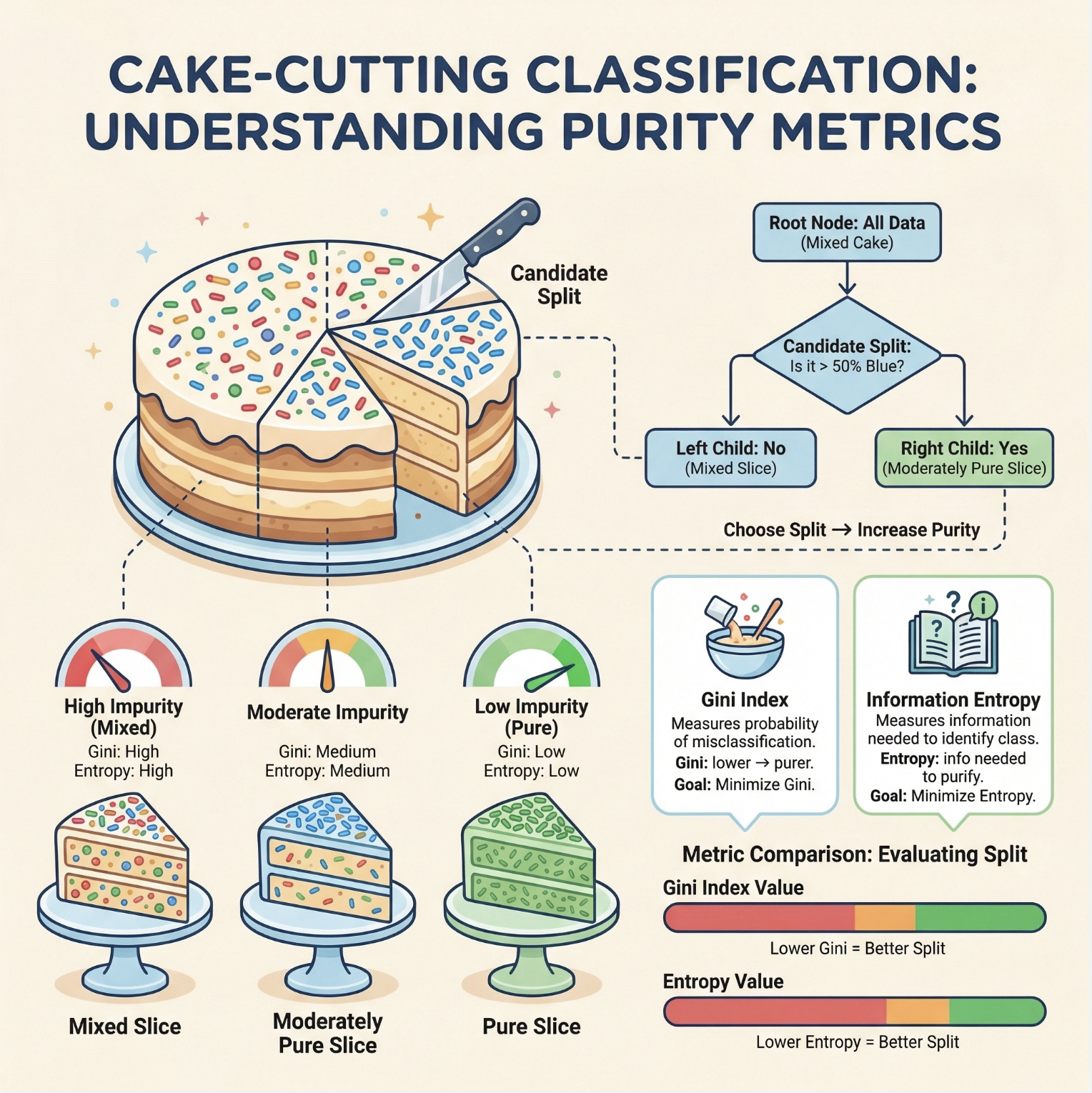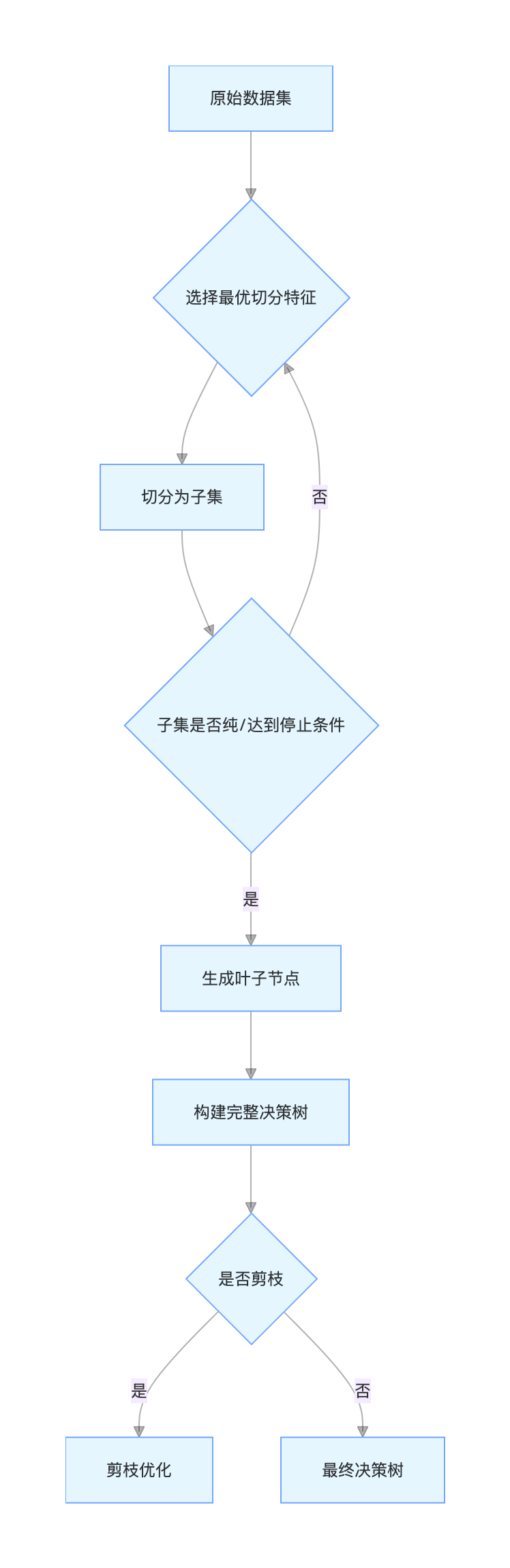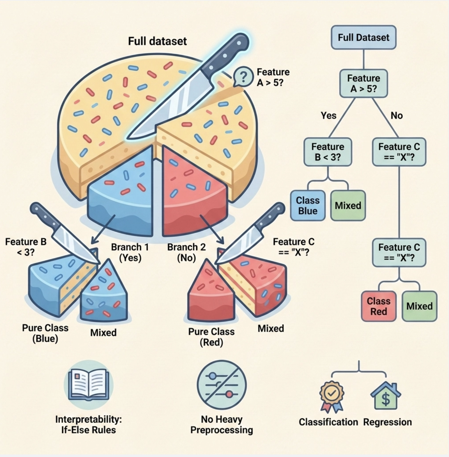 决策树本质是一种 "分而治之" 的贪心算法:把复杂的数据集像切蛋糕一样,按某个特征一步步切分,直到每个小块足够 "纯粹"(比如分类任务中,小块里全是同一类样本)。