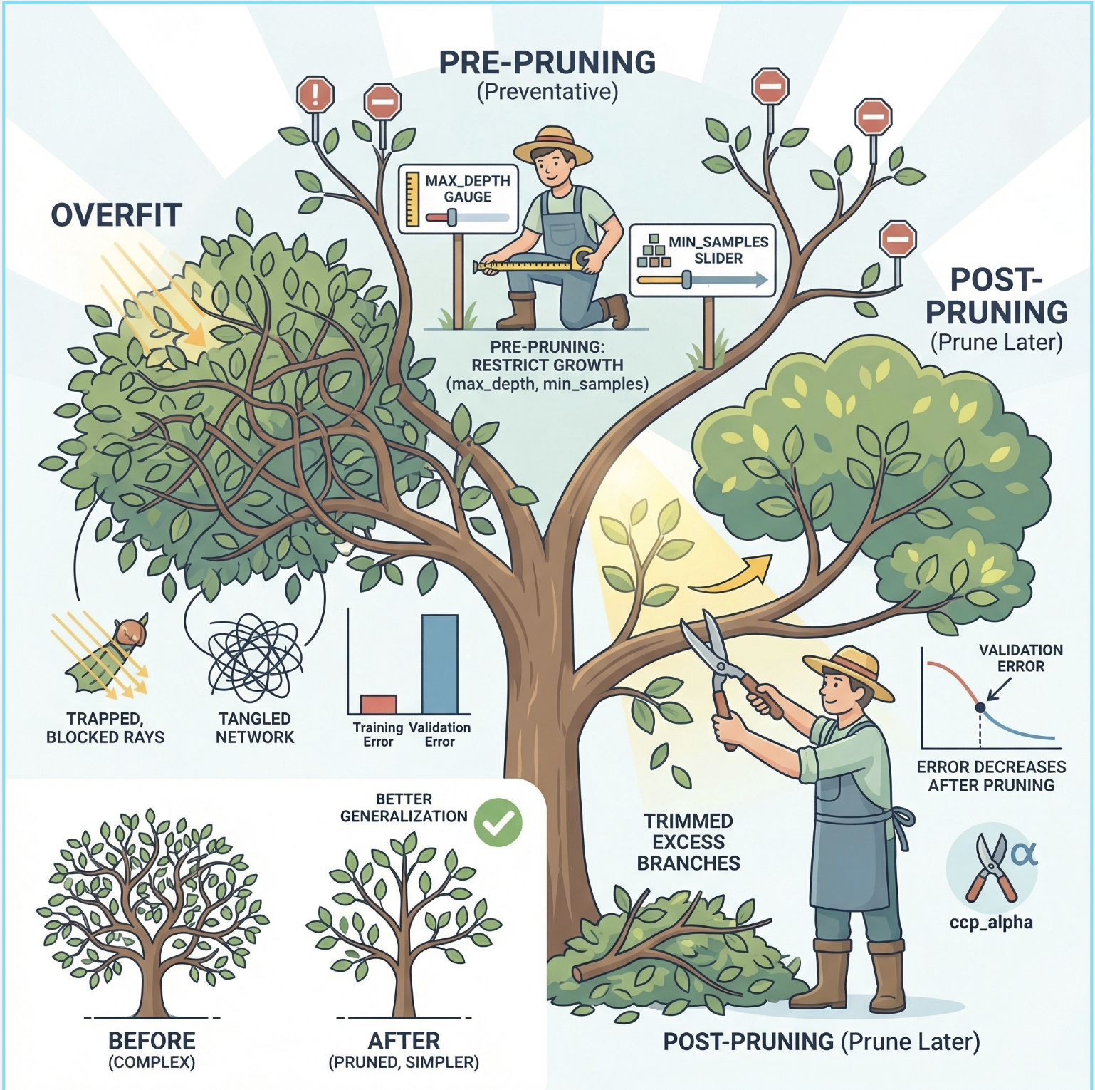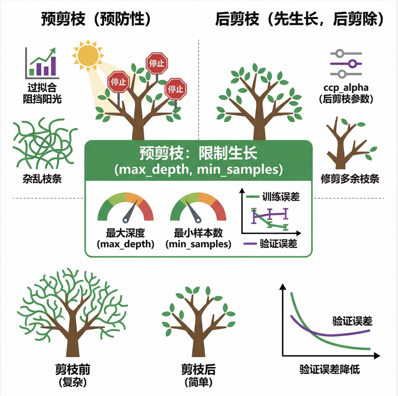 2.剪枝是解决决策树过拟合的关键:预剪枝(限制深度)简单高效,后剪枝(ccp_alpha)更精准;