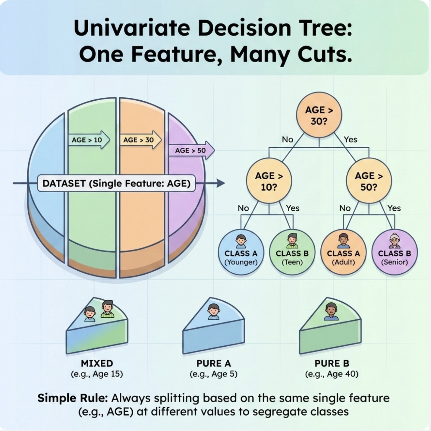 单变量树是最基础的决策树 ------ 每次切分只基于一个特征(比如只看 "年龄" 或只看 "收入"),这也是我们入门最容易理解的版本。