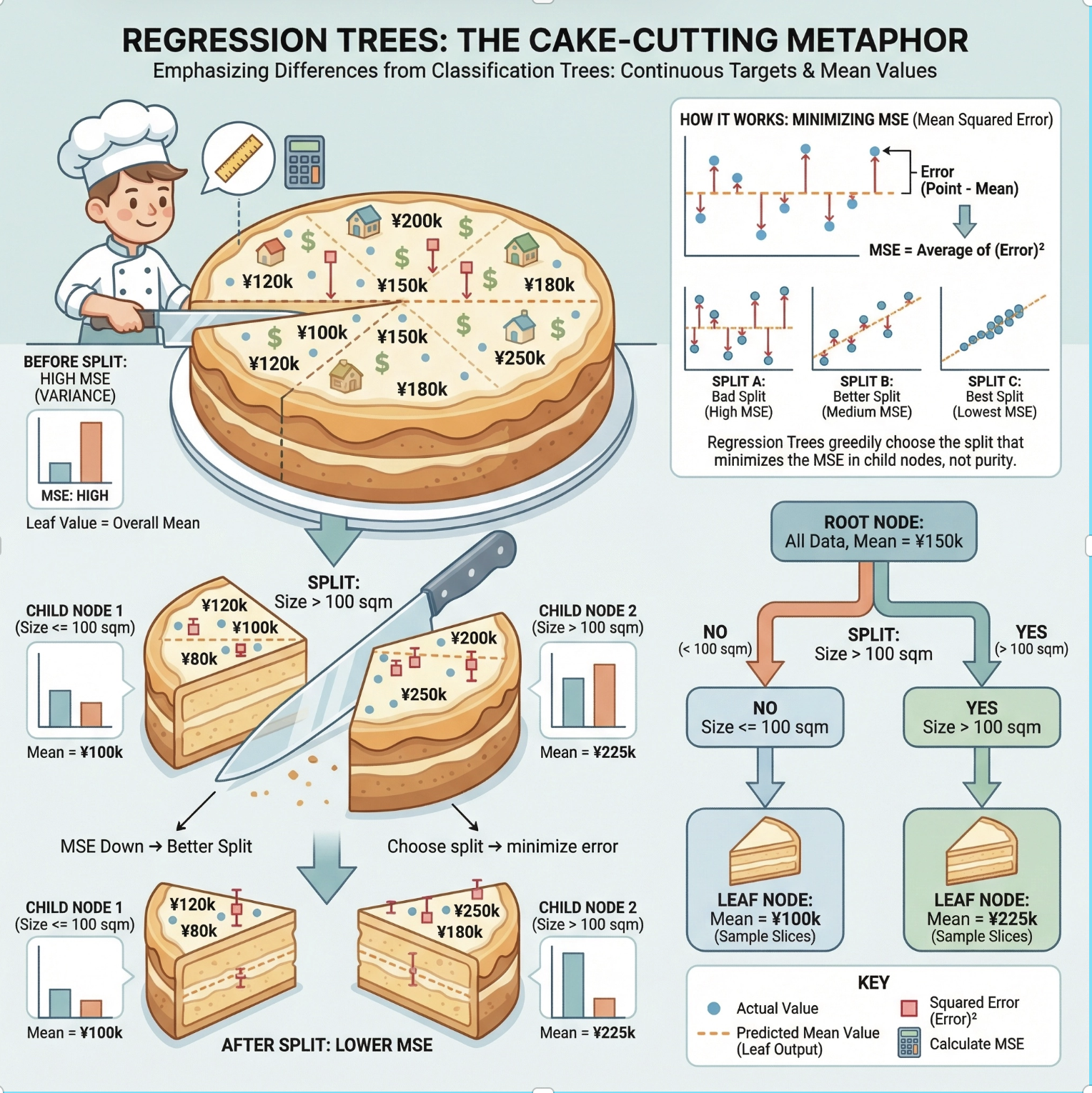 - 从数据中找 "最优切分特征"(比如用基尼系数 / MSE);