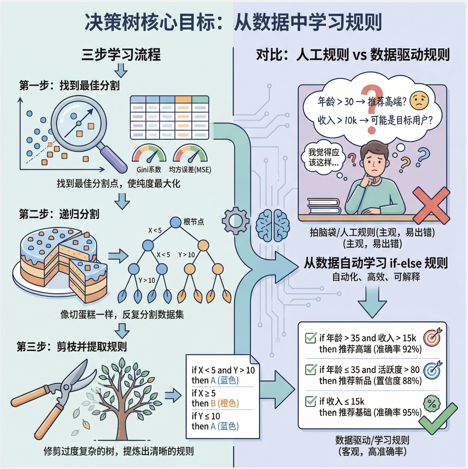 核心区别 :人工规则是 "拍脑袋"(比如凭经验定 "年龄 > 30 则推荐高端产品"),而决策树学习的规则是 "数据驱动"(从数据中找最有效的切分点)。