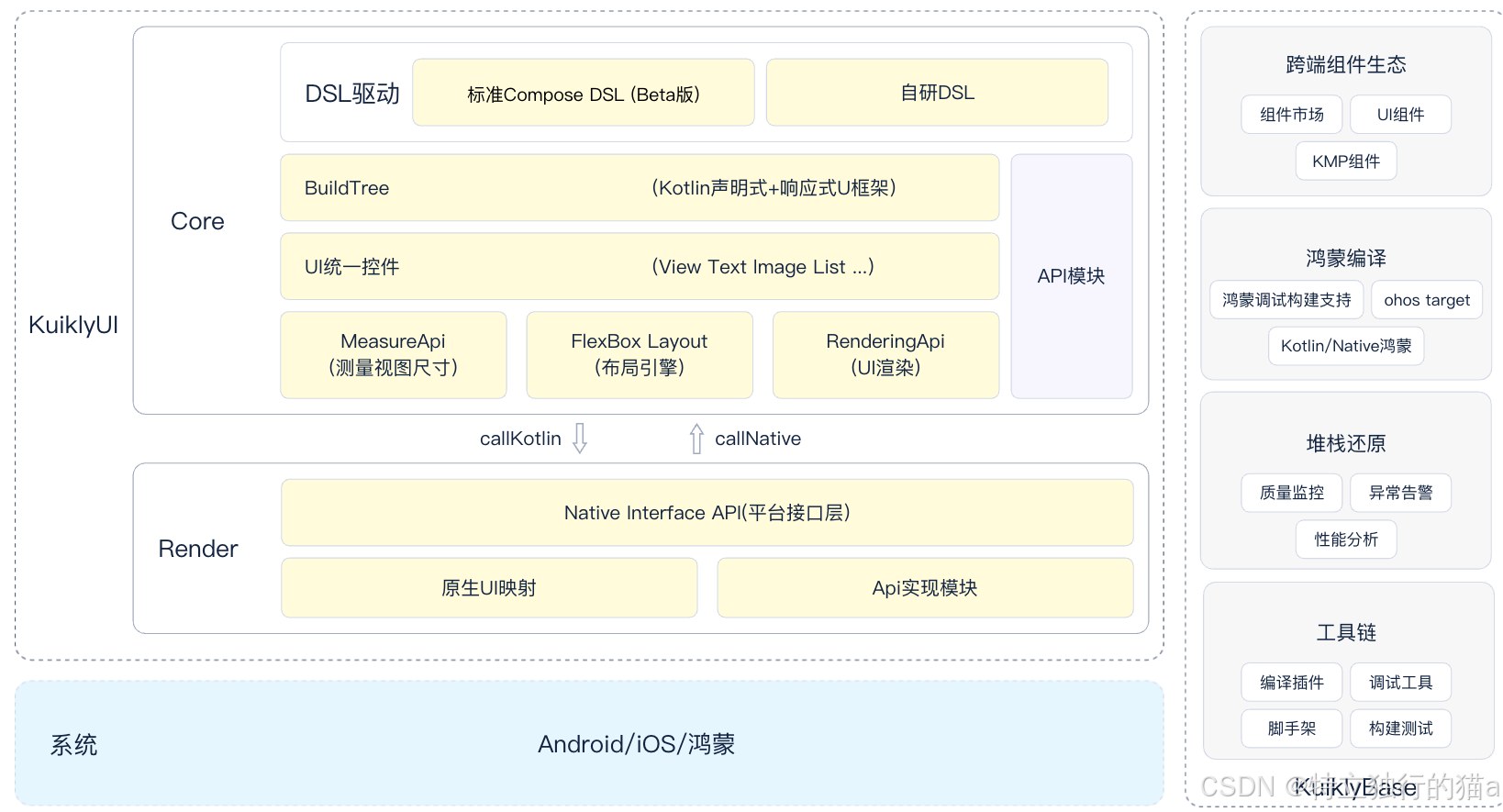 - KuiklyUI 增强:在 KMP 基础上,Kuikly 解决了 UI 跨端和各端原生 API 同步调用的痛点(如 knoi 模块可实现 Kotlin Native 与鸿蒙 ArkTS 的互调,无需编写 C/C++ 桥接代码)。
