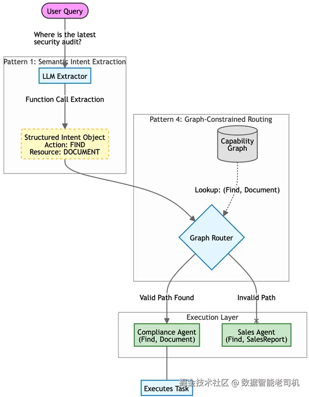 - 图约束路由(Graph-constrained routing): 查询查找表或知识图谱,确定哪个智能体声明了"对该资源执行该动作"的能力。若图中存在有效路径,则进行路由;否则将请求判定为不支持并拒绝。