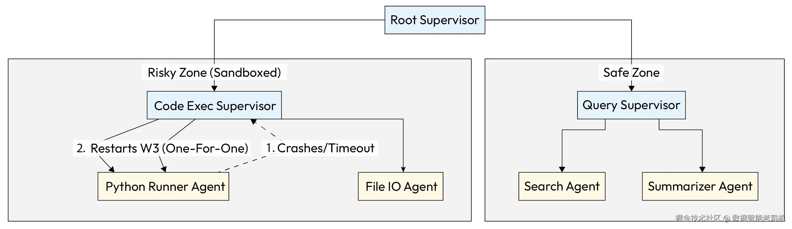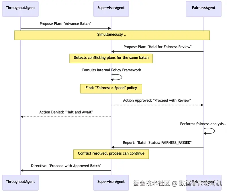 例如,当两个智能体登记要使用同一稀缺资源时,监督者可立即标记冲突。其他方法包括资源锁(智能体对即将使用的资源加锁),或要求智能体在执行前先把意图动作注册到共享空间。