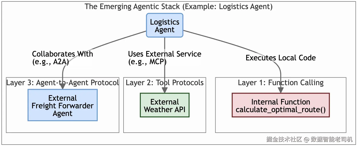 示例: 为考虑天气因素,LogisticsAgent通过工具协议发现并连接第三方天气服务API,将实时风暴数据拉入路径计算,而无需与该API实现强绑定。