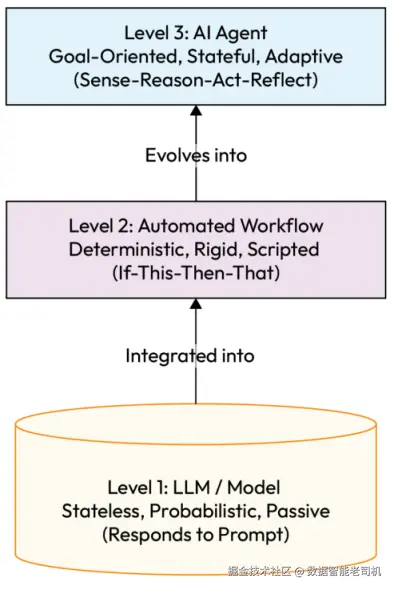 必须清楚地区分智能体式AI、简单LLM交互以及传统自动化工作流。尽管三者------LLM、自动化工作流与AI智能体------都在现代系统中扮演角色,但它们代表了根本不同的能力与自主层级,如下述层级结构所示。