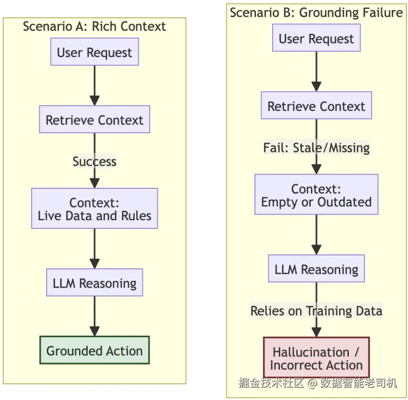 下图展示了这种高风险的动态:它对比了两类情况------一类是上下文丰富、锚定良好的健康工作流,能够支撑准确推理;另一类是一些特定失败模式,例如记忆陈旧或检索失败,导致错误行动。