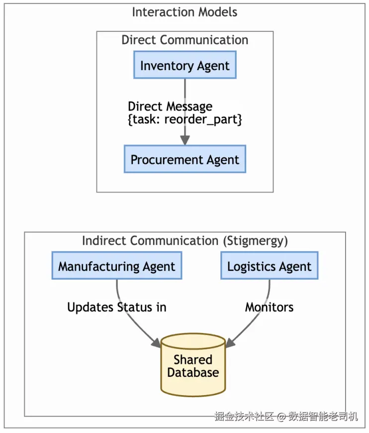 智能体也可以通过观察并修改共享环境(例如数据库)来间接交互。