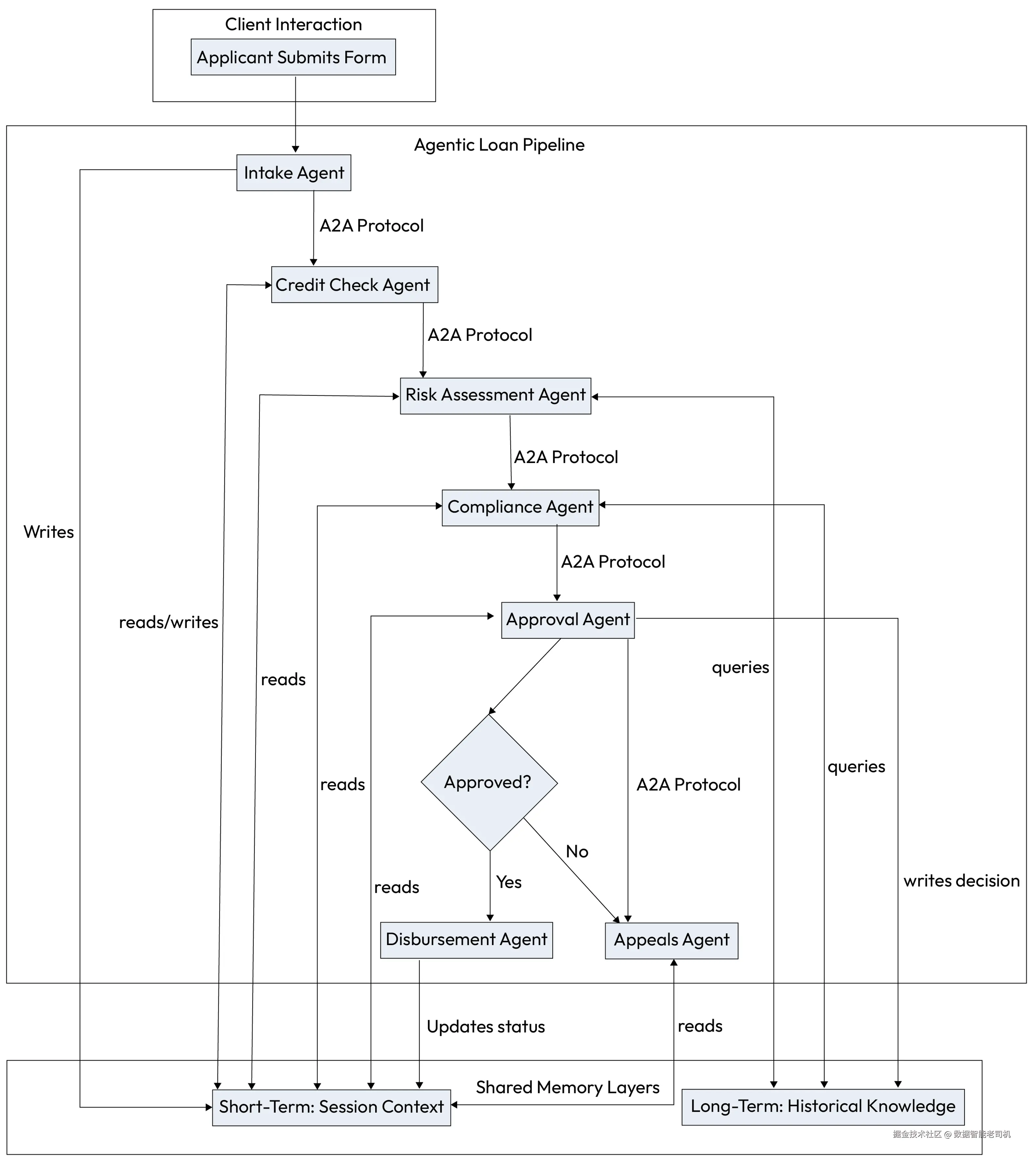 一家金融机构部署了一个多智能体系统,用于自动化并优化其贷款申请流程。该工作流从最初的客户交互一直延伸到最终放款,涵盖数据核验、信用评估、风险评分、合规检查与最终审批等环节。每个智能体专注于流水线中的一个明确阶段,并使用A2A协议进行通信与任务协调,同时访问共享记忆层以保持上下文一致。