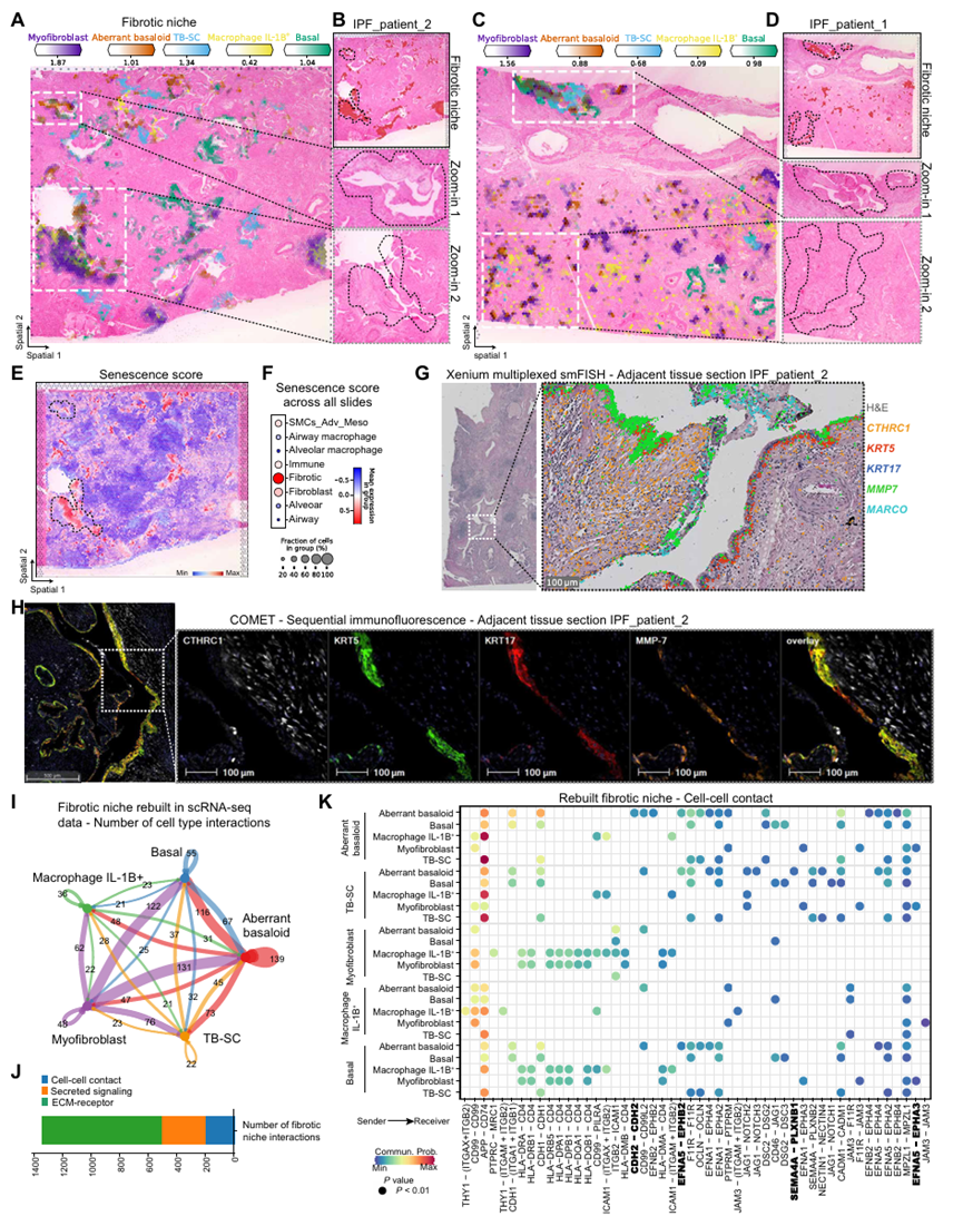 该文章基于 NMF 和频率分析着眼于生态位中包含的细胞类型。发现纤维化生态位优先位于气道周围。肌成纤维细胞也可以单独出现在更多的肺泡区域。异常的基底细胞在视觉上定位在气道上,并且总是与肌成纤维细胞一起发现。应用 Xenium 多重 mRNA 原位杂交来验证细胞类型标记基因在 patient_IPF_1 和 patient_IPF_2 的相邻组织切片。KRT5KRT17 异常基底细胞与CTHRC1细胞、KRT5KRT17 基底细胞、MMP7 气道细胞和MARCO表达巨噬细胞的巨噬细胞受体的共定位。KRT5KRT17 与 CTHRC1 肌成纤维细胞在 KRT5KRT17 基底细胞和基质金属蛋白酶 7(MMP7)气道细胞旁边的 CTHRC1 肌成纤维细胞共定位。异常的基底细胞主要与肌成纤维细胞相互作用,紧随其后的是基底细胞和结核病-SC,为其气道(如特征)提供了进一步的证据。而肾上腺素通路是除了钙粘蛋白(CDH)和缺口信号传导之外的主要贡献者。进一步分析发现,受体 EPHB2 由异常基底细胞特异性表达,而受体 EPHA3 似乎对肌成纤维细胞具有特异性。两者都接收到来自 EFNA5 的信号,并且主要由气道上皮细胞群表达。纤维化生态位内的细胞间通讯可归因于 ECM-受体相关的配体-受体对------其中超过 60%可以分配给胶原蛋白、层粘连蛋白、血栓反应蛋白和纤连蛋白通路。