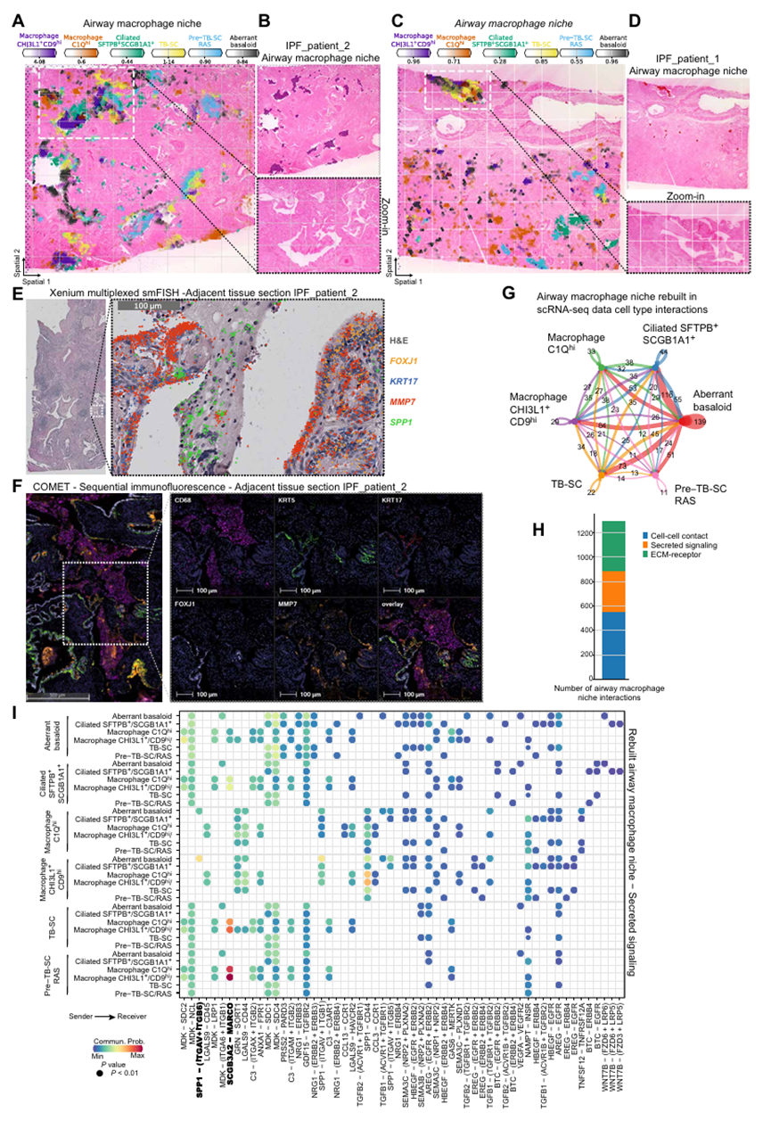 基于非负矩阵分解(NMF)分析结果(图 2A),研究聚焦气道巨噬细胞生态位的核心细胞类型,通过组织切片观察验证了关键细胞的共定位关系:CHI3L1 + 巨噬细胞、C1Q + 巨噬细胞与异常基底细胞、TB-SC 细胞(终末支气管分泌细胞)、SFTPB + 纤毛细胞在 IPF 组织切片中形成稳定的共定位群体。这一结果进一步支持了气道巨噬细胞生态位的空间定位特征:该生态位优先定位于看似宽大但实际为远端的气道区域,且特异性与 SFTPB + 纤毛细胞共定位(图 2A、4A、图 S15)。细胞类型分布统计显示,肌成纤维细胞几乎仅存在于纤维化生态位,而异常基底样细胞不仅是纤维化生态位的核心细胞,也有 20% 的比例参与构成气道巨噬细胞生态位,这一共定位特征通过组织切片观察得到确认(图 2A、4A、C)。利用 Xenium 多重 mRNA 原位杂交技术,研究在 mRNA 水平进一步验证了气道巨噬细胞生态位的细胞构成与空间结构:气道管腔内壁由 FOXJ1 + 纤毛细胞、KRT17+TB-SC 细胞、MMP7 + 气道细胞构成,而管腔内则聚集大量 SPP1 + 巨噬细胞(主要为 CHI3L1 + 巨噬细胞),各类细胞的标记基因表达区域高度重叠,明确了 "上皮细胞衬里 - 巨噬细胞填充" 的管腔结构特征(图 4E、图 S7C、G;图 S8C、G、K)。在相邻组织切片的蛋白质水平验证中,采用 COMET 高重序贯免疫荧光技术观察到:气道结构内壁可检测到纤毛细胞标志物 FOXJ1、TB-SC 细胞标志物 KRT17、气道细胞标志物 MMP7 的蛋白质表达,而气道管腔内充满巨噬细胞特异性标志物 CD68 阳性的细胞(图 4F、图 S9B、D)。这一结果与 mRNA 水平验证完全吻合,形成了 "基因 - 蛋白质 - 细胞定位" 的完整证据链,充分证实了气道巨噬细胞生态位的真实性与空间结构特征。