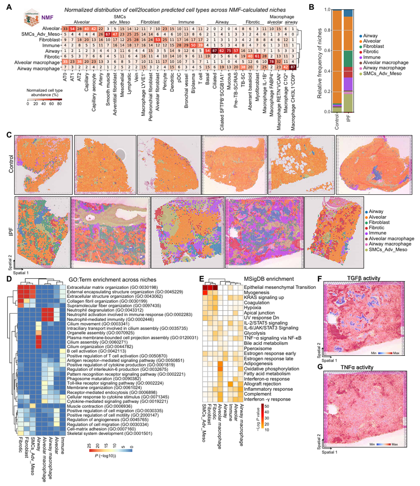该研究将 cell2location逐个细胞类型的点输出矩阵转换为细胞类型和生态位以及斑点和生态位的矩阵,确定了 8 个具有不同细胞类型谱和相应标记基因特征的细胞生态位。进一步评估了这些生态位在对照和 IPF 组织中的相对频率。对照组织中,肺泡生态位占比最高,其他生态位占比极低;IPF 组织中,肺泡生态位占比显著下降,纤维化生态位、免疫生态位、气道巨噬细胞生态位等占比大幅上升,反映出 IPF 肺组织中正常结构破坏,病理生态位占据主导的特征。进一步通过GO分析分析不同生态位的细胞功能特征。值得注意的是MSigDB 基因可以表征纤维化生态位,TGFβ和TNFα也可以代表不同的生态位点。