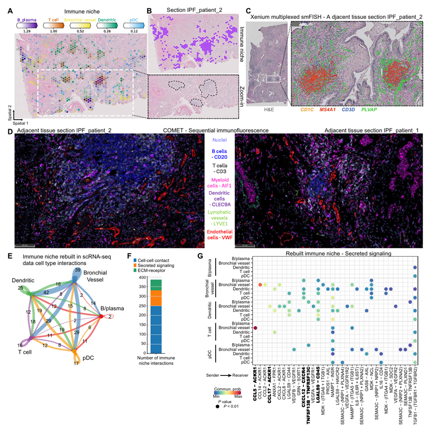 免疫生态位是 IPF 组织中普遍存在的第三个病理生态位,核心细胞包括 B 细胞、浆细胞、T 细胞、浆细胞样树突状细胞(pDC),以及 PLVAP + 异位内皮细胞群(命名为支气管血管细胞)(图 S5B)(16,37,38)。与健康对照相比,构成该生态位的所有细胞类型在 IPF 组织中均显著增加,且聚集形成独立病灶,在 H&E 染色切片中呈灰色可见(图 5A、B;图 S18)。通过组织切片验证,上述细胞形成稳定共定位群体,且标志性基因表达与细胞类型高度匹配:B 细胞和浆细胞表达 CD19、CD79A、MS4A1,T 细胞表达 CD3D,支气管血管细胞表达 PLVAP(图 5A、B;图 S19A-C),进一步确认了细胞构成的准确性。作者进一步通过mRNA与蛋白质水平进行了验证。此外,细胞间通讯发现支气管血管细胞是免疫生态位的核心调控细胞,对生态位内及与其他细胞的配体 - 受体相互作用贡献最大,主要依赖于两个轴:CXCL12-CXCR4 轴和CCL17/CCL5-ACKR1 轴。