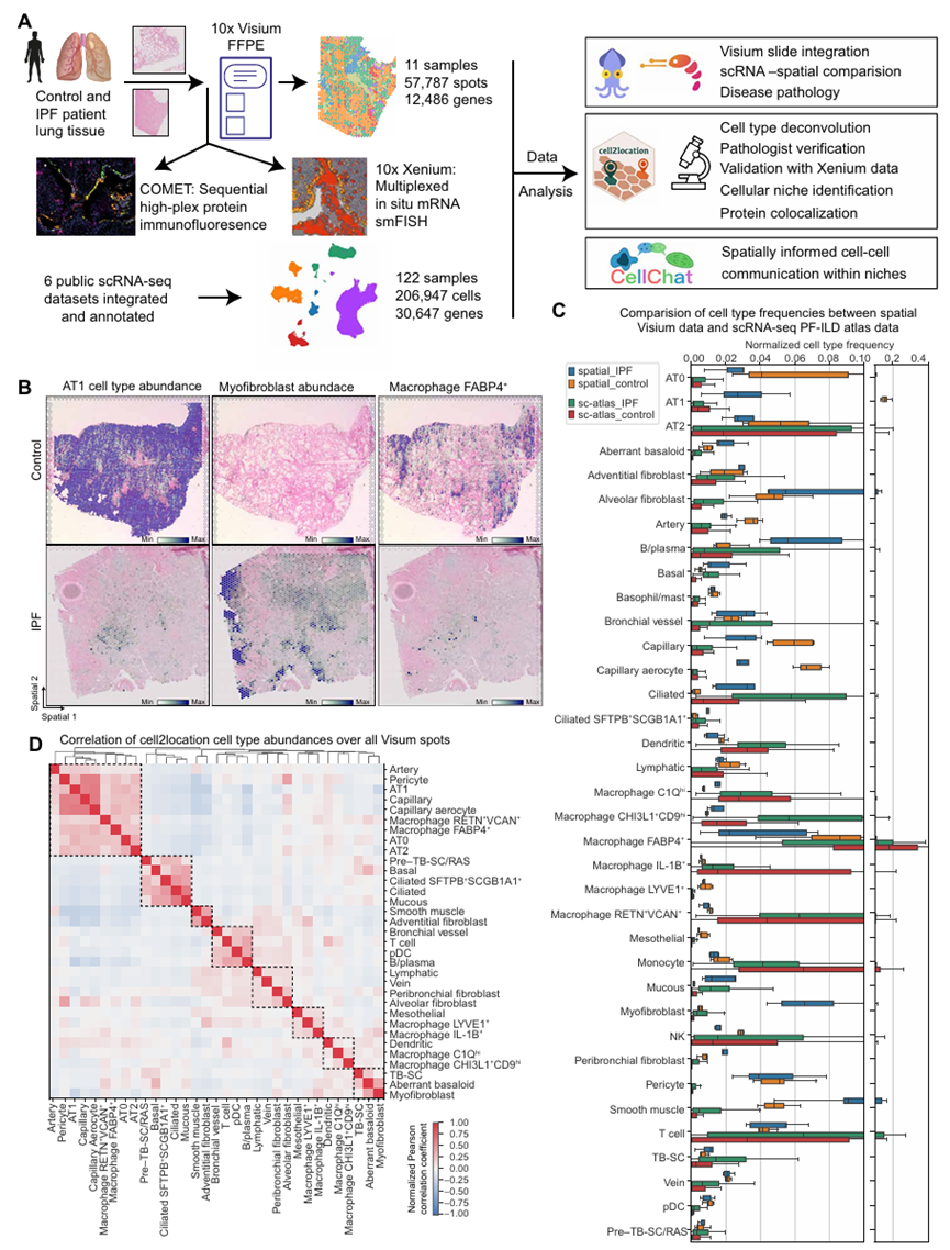 该研究通过对IPF患者和对照者的FFPE组织切片,应用Visium和 Xenium技术分析空间转录组。整合已发表的肺纤维化和间质性肺病(PF-ILD)scRNA-seq 数据集,通过生物信息学解卷积Visium斑点的细胞类型组成,实现细胞类型与基因的组织定位映射。