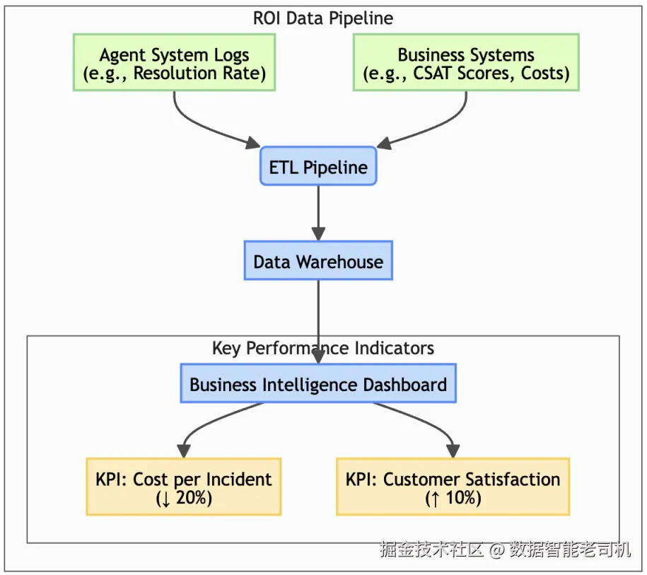 "衡量业务价值"模式是关键的桥梁:它把智能体系统的运营数据,连接到业务的核心财务与运营指标上。它的本质是把技术成就翻译成企业语言:关键绩效指标(KPIs)与投资回报(ROI) 。