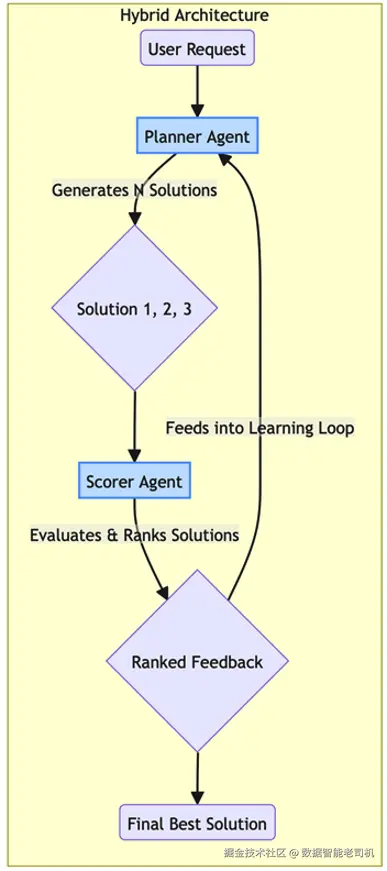 为解决这一点,我们引入所有自我改进系统的基础模式:混合(规划器 + 评分器)架构(Hybrid (Planner + Scorer) Architecture) 。该模式通过将系统设计为两个不同的智能体角色,实现关键的关注点分离 。它构建出"生成器---评估器"的动态关系,从而提供客观、可靠的反馈,把抽象的"评估"转化为可落地、可自动化的工程过程。