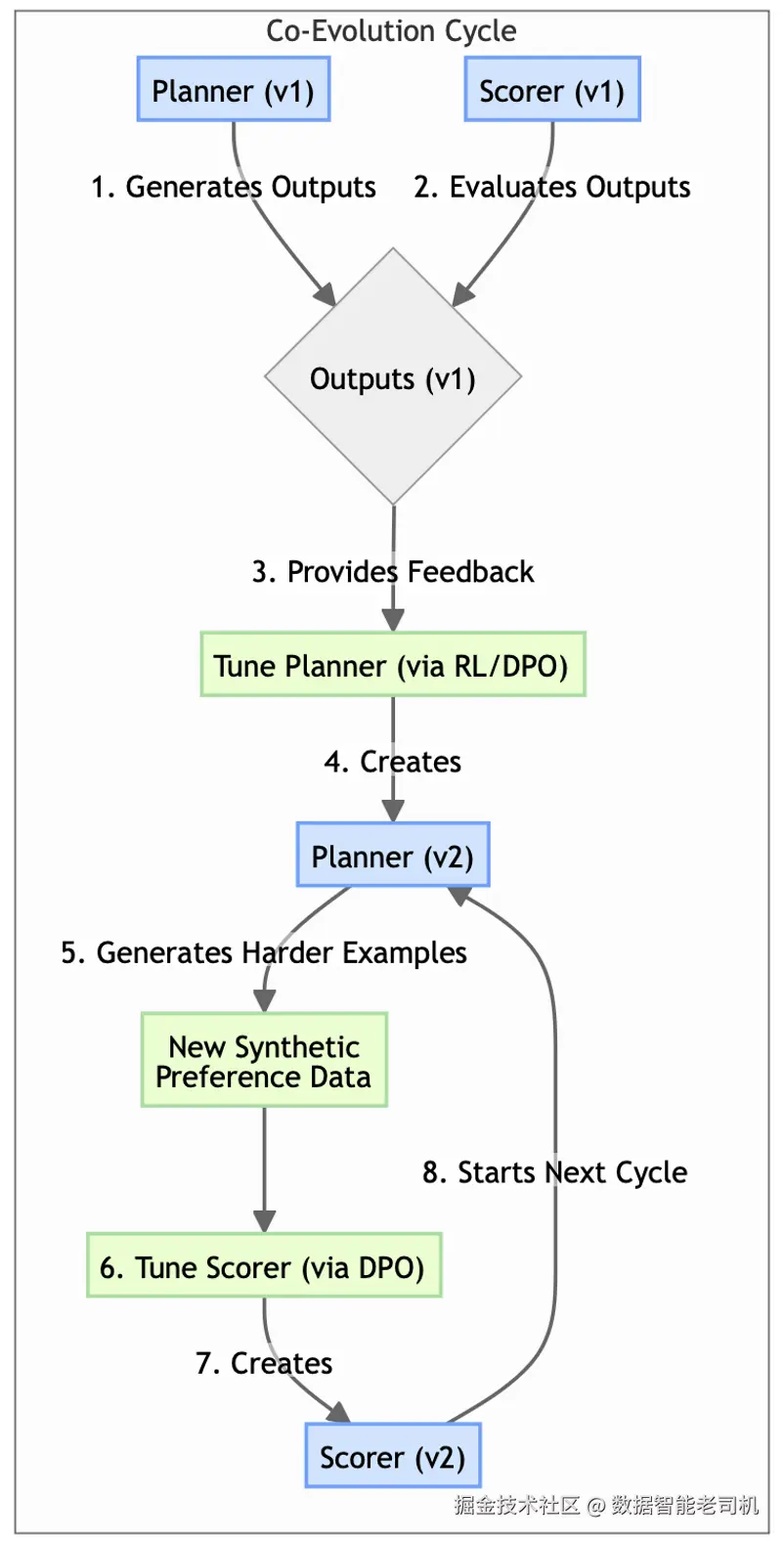 - 协同进化驱动指数增长 :最强的学习系统采用协同进化智能体训练(Coevolved Agent Training) 模式,让规划器与评分器同步提升,形成能力加速增长的良性循环。