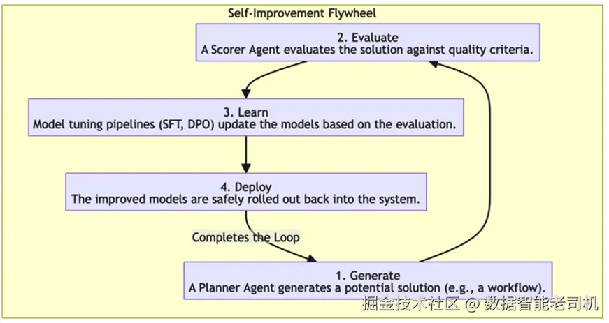 这也意味着一种根本性的思维转变:从"只是构建智能体",转向"培育 智能体"。我们将引入一个概念模型------自我改进飞轮(Self-Improvement Flywheel) ------来结构化这段旅程,并探索驱动每个阶段的关键模式:从生成新颖方案,到评估其质量,最后从结果中学习。