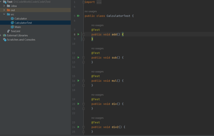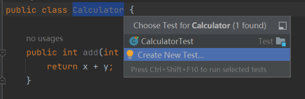 选择类名,使用快捷键 Ctrl+Shift+T -> Creat newTest ,即可快捷生成Calculator类的测试框架