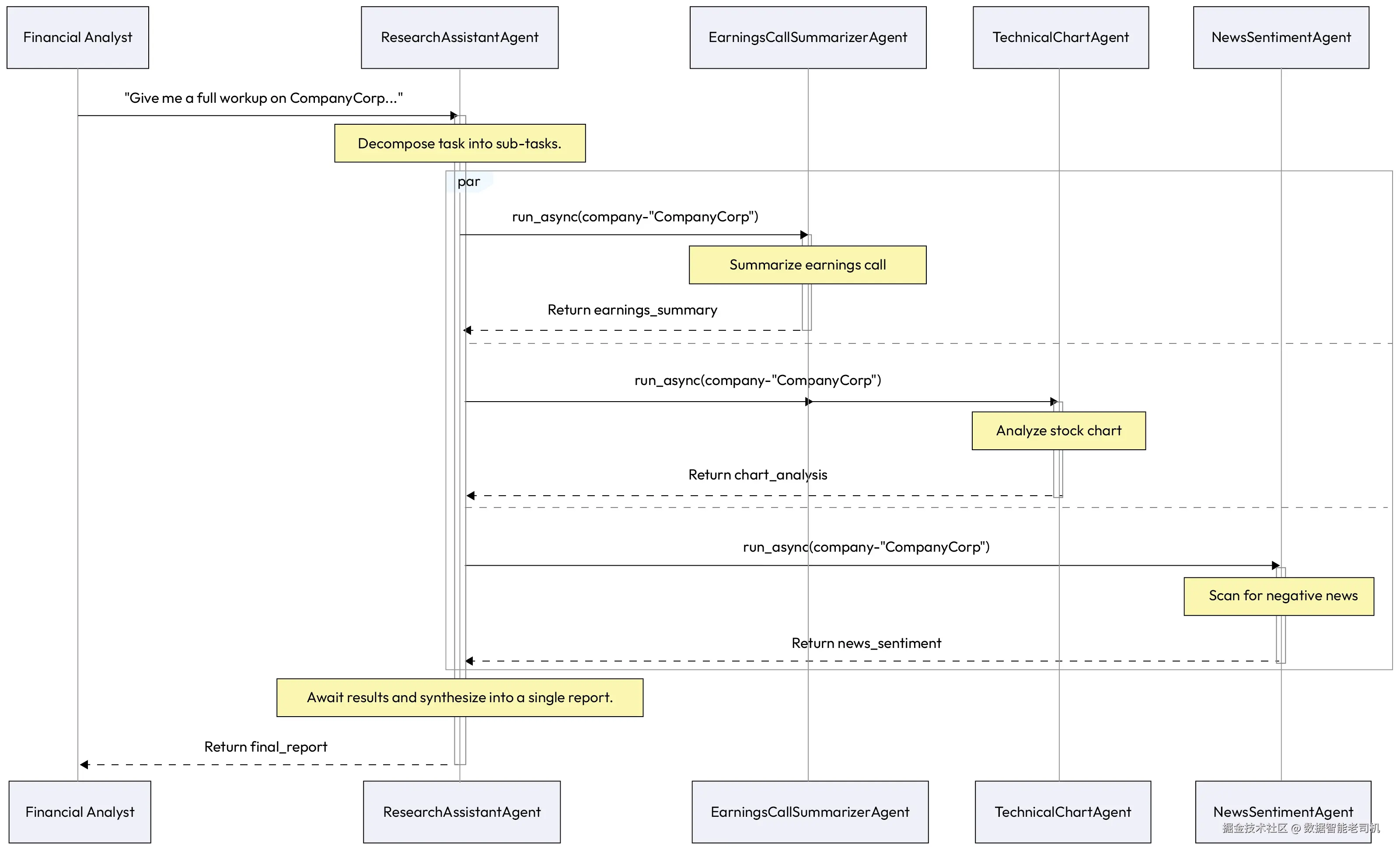 专家与执行智能体层(Specialist and worker agent tier) :该层包含执行核心业务逻辑的功能型、细粒度智能体(例如 FlightBookingAgent、NewsSentimentAgent)。